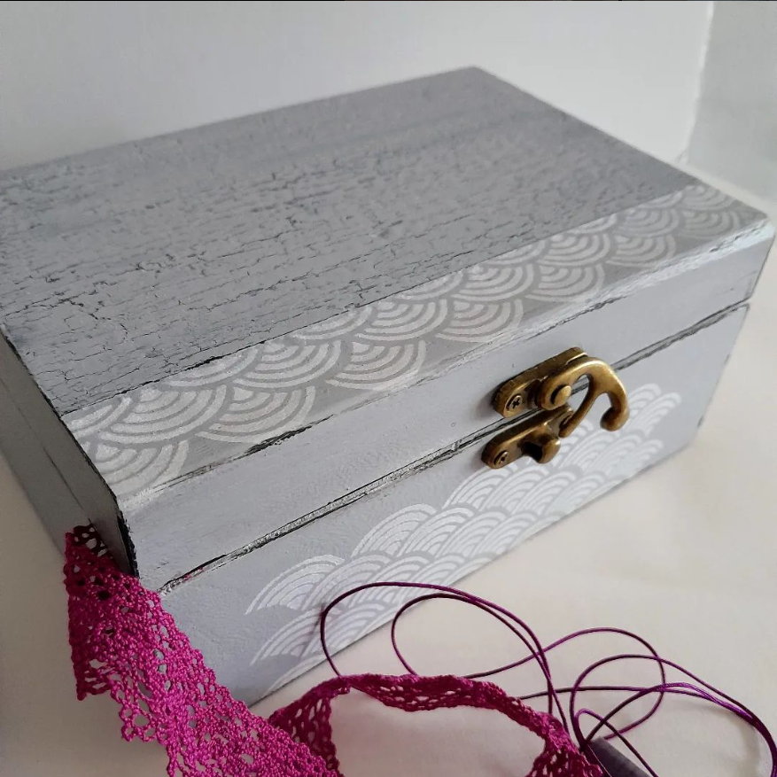 Caja de madera con cierre envejecido, de color gris con craquelado y stercil.